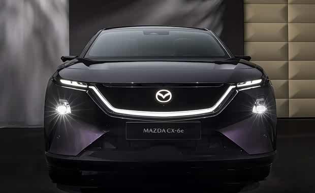 从外观来看,CX-6e延续了马自达家族化的设计语言,前脸日间行车灯造型富有未来感,勾勒出中网轮廓,同时品牌标识也具备发光功能。新车采用分体式大灯布局,主大灯组位于两侧进气口区域。