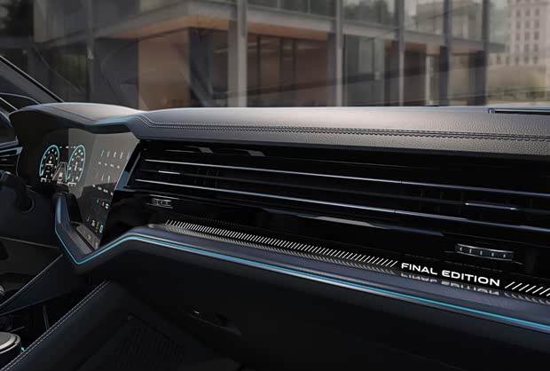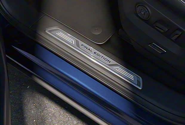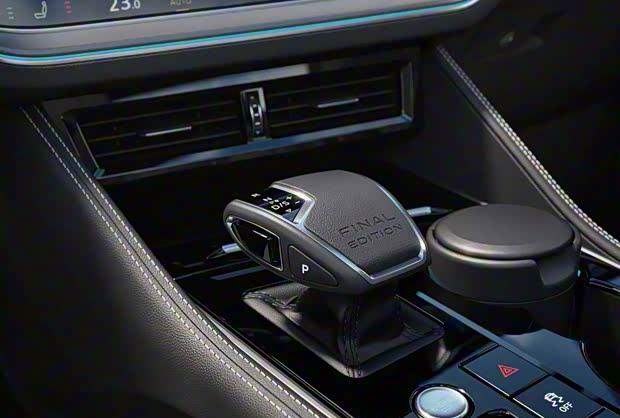内饰方面延续了外观的运动风格,以黑色为主色调。特别之处在于换挡杆的皮革包裹上压印有"Final Edition"专属标识。车内氛围灯也经过特别设计,在副驾驶侧的仪表板及门槛饰条上均可看到最终版标识。车辆前排配备15.05英寸中控屏与12英寸液晶仪表组成的数字座舱。