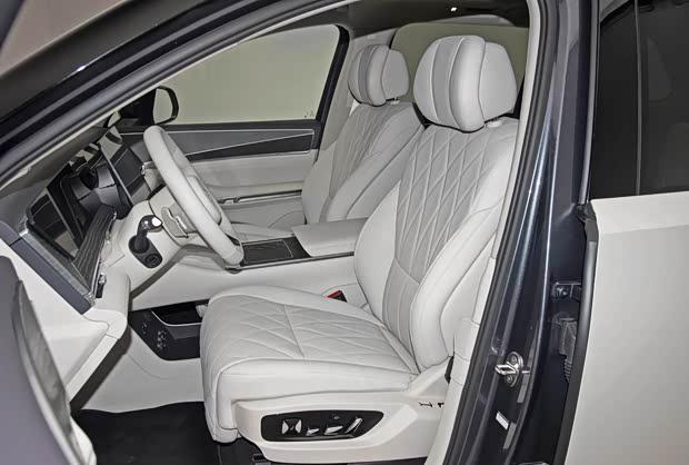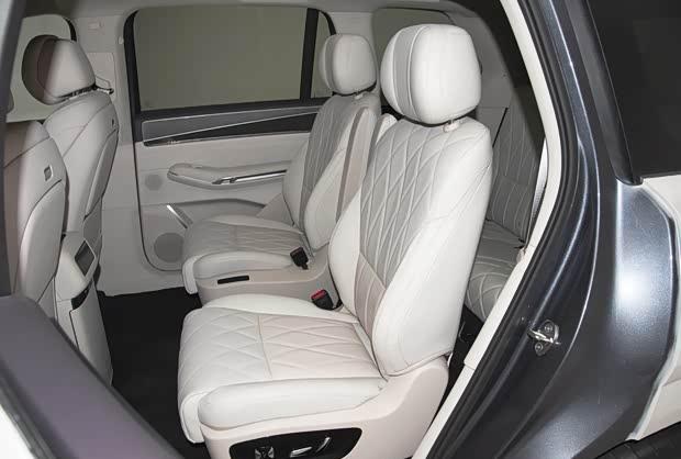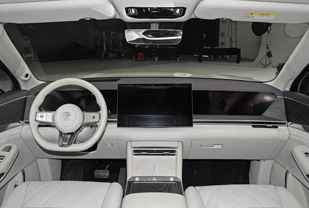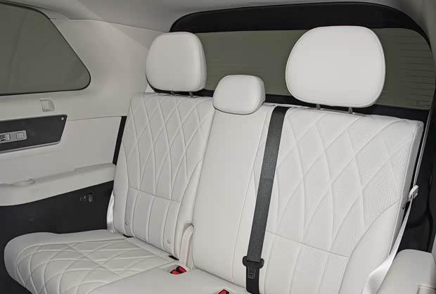 内饰方面,座舱采用三屏布局营造豪华氛围,配备抬头显示系统与27扬声器高端音响。座椅采用2+2+3排列形式,第二排为双零压独立座椅,带有折叠屏、一体式腿托及菱形缝线装饰,支持一键放平功能。第三排座椅同样可实现电动调节。