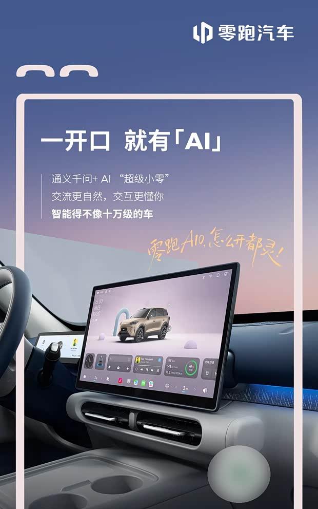 从官方发布的内饰图来看,新车中控台线条设计较为平直,整体风格简洁明快。车内标配了双辐式多功能方向盘、8.88英寸全液晶仪表盘以及一块14.6英寸2.5K分辨率的悬浮式中控屏,共同营造出年轻化的座舱氛围。此外,车辆还配备了车内氛围灯、手机无线充电槽与双杯架等实用配置。值得关注的是,零跑A10将搭载基于通义千问大模型开发的AI语音助手“超级小零”,官方称其人机交互体验将更为流畅自然。