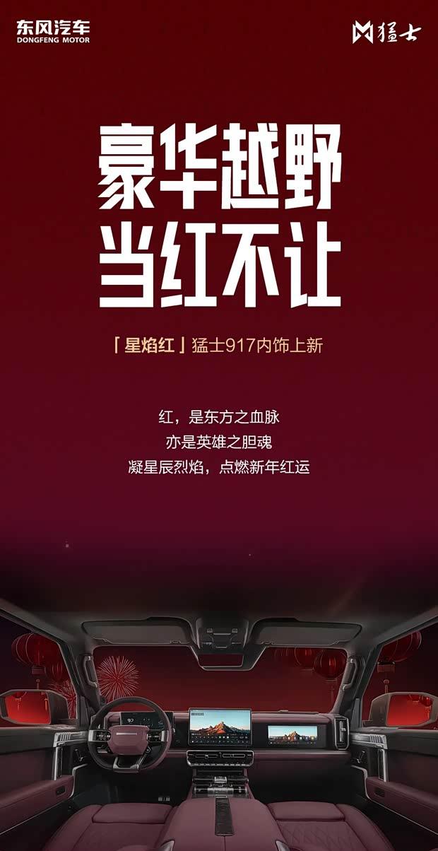 猛士品牌旗下两款车型近日迎来内饰配色更新。猛士M817新增“锦川红”内饰,猛士917则提供“星焰红”内饰选项。
