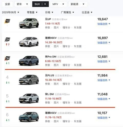 从市场定位来看,宋Pro DM-i属于插混紧凑型SUV,同级车型包括吉利银河星舰7 EM-i。根据8月销量数据,宋L与宋Pro DM-i单月销量均突破一万辆,跻身比亚迪SUV销量前五。