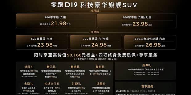 4月16日,零跑汽车旗下全新大型SUV——零跑D19正式推向市场。新车提供增程与纯电两种动力形式,共计7款配置。其中增程版3款,价格区间为21.98万元至23.98万元;纯电版4款,售价在23.98万元至26.98万元之间。在5月31日前下订的用户,还可享受包括15000元选装基金在内的多项购车权益。