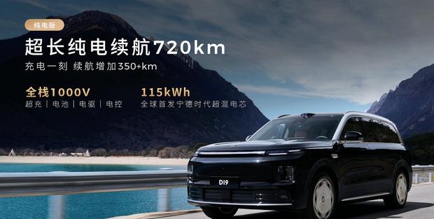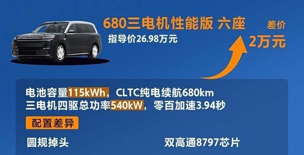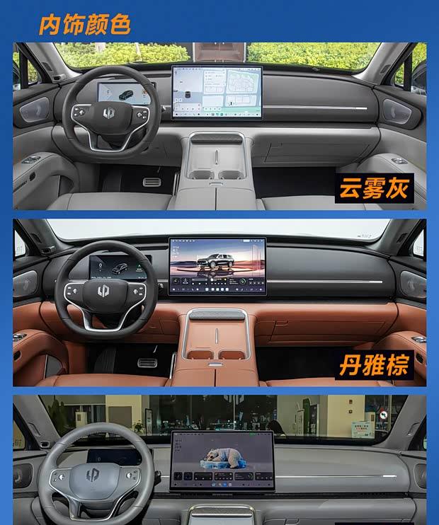 动力系统上,增程版全系采用双电机四驱,系统功率300千瓦,提供63.7千瓦时+52升油箱与80.3千瓦时+40升油箱两种储能组合,CLTC纯电续航分别为400公里和500公里,综合续航最高达1300公里。该车型基于800V平台打造,充电30%至80%需时15分钟。纯电版采用1000V平台,双电机版功率410千瓦,提供99.6千瓦时和115千瓦时两种电池,对应续航为620公里和720公里;顶配三电机版综合功率达540千瓦,0-100公里/小时加速时间为3.94秒。