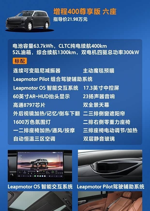 智能化是新车的一大亮点。其搭载全新Leapmotor OS系统,支持3D车模成像、全域车道级SR导航等功能。智能助手“超级小零”整合了AI大模型,具备更强的交互能力。座舱内前排配备10.25英寸液晶仪表、17.3英寸中控屏及60英寸AR-HUD。后排则提供了6英寸控制屏与21.4英寸娱乐屏,后者拥有莱茵低蓝光认证。音响系统为23扬声器配置,峰值功率2304瓦。