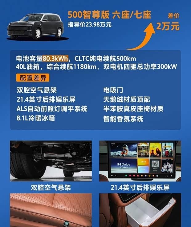 在车型选择上,分析指出,入门增程400尊享版虽配置丰富,但因无法享受部分限时选装权益,目前并非最推荐选项。增程500智尊版及纯电620/720智尊版在配置上更为全面,增加了空气悬架、后排娱乐屏、高级内饰材质等,被认为是更值得考虑的选择。顶配纯电680三电机性能版则主要面向追求极致动力的用户。