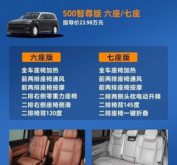 座椅功能极为丰富。前排座椅标配电动调节、加热、通风、按摩及记忆功能。六座版第二排右侧为零重力座椅,支持电动横滑;七座版第二排椅背最大可调至145度。两种布局的二排座椅均标配加热、通风与按摩。第三排座椅也支持电动调节、加热及一键折叠。此外,车辆还标配后排电动遮阳帘、8.1升冷暖箱等舒适配置。