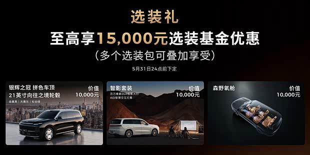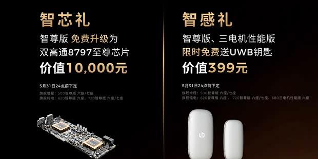 选装方面,提供银辉之冠拼色车顶、智影套装三种选装包,选装价均为1万元。5月31日前下定可使用15000元选装基金进行抵扣。此外,限时权益还包括免费升级双高通8797芯片、赠送UWB数字钥匙等。