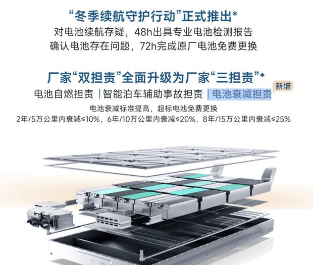 企业还宣布了两项新举措:启动"冬季续航守护行动",对电池续航存在疑虑的用户可在48小时内获得专业检测报告,若确认电池存在质量问题,将在72小时内提供原厂电池免费更换服务。同时,厂家责任保障体系从"双担责"升级为"三担责",在原有电池自燃责任和智能泊车辅助事故责任基础上,新增了"电池衰减担责"内容。