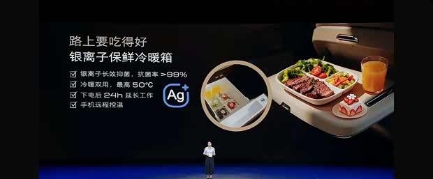 舒适与便利配置方面,车辆配备二排多功能桌板、15.6英寸后舱娱乐屏、7.1.4声道杜比全景声音响系统及多色智能交互氛围灯。前风挡与四门车窗均采用5毫米双层夹胶静音玻璃,后排配备隐私玻璃。车内还设有支持2摄氏度至50摄氏度宽域调温的银离子保鲜冷暖箱,后备厢容积可在650升至1798升之间灵活变化。