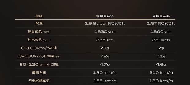 动力系统部分,新车搭载名为“真龙插混Pro”的插电混动系统。其中一套动力组合采用1.5T混动专用发动机,最大功率115千瓦,峰值扭矩230牛·米,驱动电机最大功率165千瓦,系统综合功率280千瓦。另提供1.5升发动机版本,系统综合功率为237千瓦。车辆配备容量32.6千瓦时的电池组,CLTC工况纯电续航里程为235公里,综合续航里程最高可达1630公里。底盘方面搭载预瞄式RTD连续阻尼可变悬架,可依据路况实时调节阻尼。
