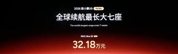 小鹏汽车旗下新款X9纯电版于3月2日正式上市,共推出5款车型,官方指导价区间为30.98万元至36.98万元。同时,2026款X9增程版新增一款1602 Ultra SE车型,售价为32.18万元。作为年度改款车型,新车在外观细节上进行了微调,并在智能驾驶辅助系统方面实现显著升级,全系搭载第二代VLA系统,进一步提升了驾驶辅助能力。