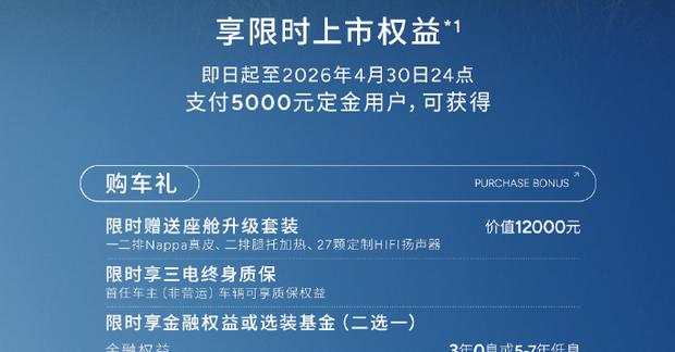 即日起至2026年4月30日24时前,订购2026款X9纯电版可享受最高价值50000元的限时权益,包括三电终身质保、价值12000元的座舱升级套装、至高30000元金融/选装基金、至高15000元置换权益以及6年内每年1500度电卡复购权益。增程版车型在2026年3月31日前下定可享受相同权益。此外,2024款与2025款X9车主置换新车可获得额外1万元代金券补贴。早鸟权益同步限时返场,3月2日22时前下定全系车型可享2000元抵7000元购车款优惠。