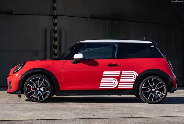 从外观来看,新车采用了经典的红色作为主色调,复刻了上世纪60年代赛车的标志性配色。发动机舱盖上装饰有白色拉花,增强了整车的运动氛围。车身侧面则印有数字“52”标识,还原了当年冠军赛车的编号。此外,白色拉花上还加入了1965年的赛车车牌“AJB 446”,C柱位置也镶嵌了专属的“1965”徽章,进一步突出其独特身份。车辆还配备了纪念版配色的JCW气门嘴帽以及专属悬浮式轮毂盖等细节配置。