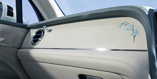 进入车内,浅色系皮革内饰营造出温馨氛围。座椅靠背上绣有蓝色的宾利徽标,中控台则装饰了精致的蓝色花朵图案。此外,专属的“Something Blue Collection”铭牌被镶嵌于迎宾踏板之上,彰显其独特身份。