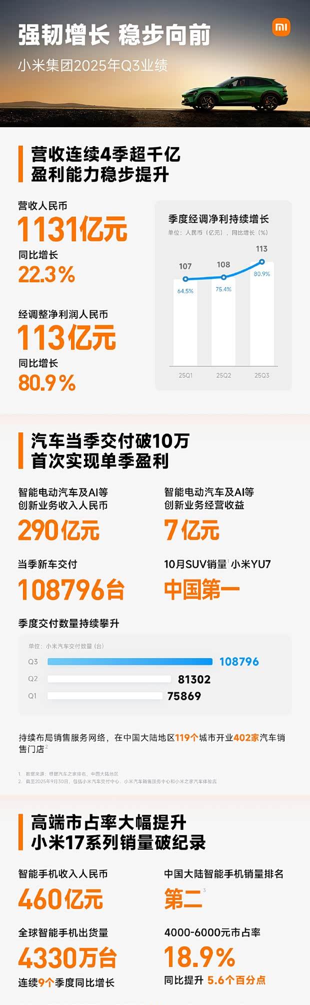 在汽车业务领域,本季度取得突破性进展。智能电动汽车及AI等创新业务收入达到290亿元,同比增长超过199%。当季新车交付量达108796台,首次实现单季盈利。其中小米YU7车型在10月份国内SUV市场销量中位居首位。目前销售服务网络已覆盖全国119个城市,开设402家汽车门店。
