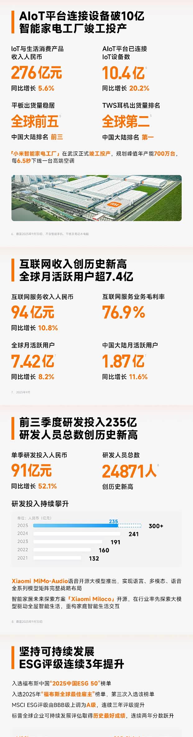 在技术创新方面,前三季度累计研发投入已达235亿元,预计全年将突破300亿元。公司推出了Xiaomi MiMo-Audio语音开源大模型,完成了语言、多模态、语音全系列模型矩阵的战略布局。同时开源的「Xiaomi Miloco」智能家居探索方案,率先在行业内探索大模型驱动的全屋智能生活应用。