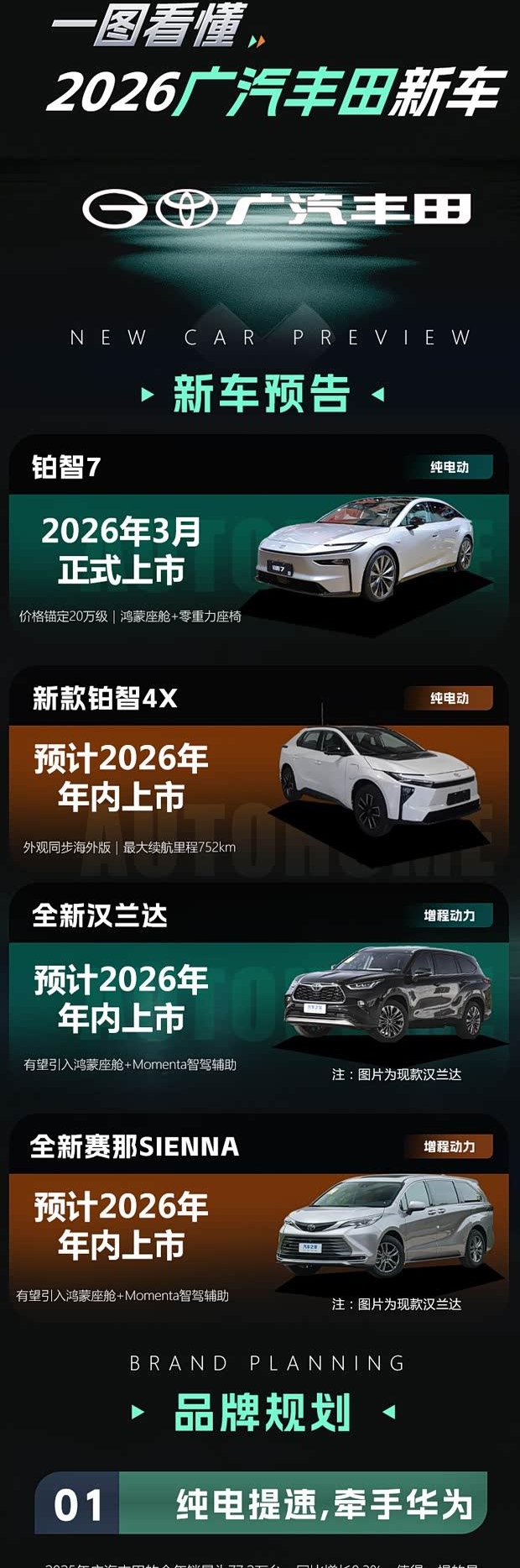2026年,广汽丰田的产品规划已初现轮廓。第一季度,定位“纯电豪华旗舰”的中大型轿车铂智7将上市,预售价锚定20万元级别。该车将标配鸿蒙座舱5.0系统及丰富的舒适配置,并搭载Momenta R6智驾辅助系统。动力方面采用华为Drive One电驱,提供不同电池容量和续航版本。此外,新款铂智4X也已现身工信部申报目录,外观预计与海外版bZ车型同步更新。根据此前科技日信息,全新汉兰达和全新赛那SIENNA也将在2026年推出,预计采用增程动力,并进行深度本土化智能升级。广汽丰田还表示,正在研发高性能插电混动车型,并致力于普及第五代及研发第六代混动技术,同时计划为纯电车型搭载量产版固态电池。