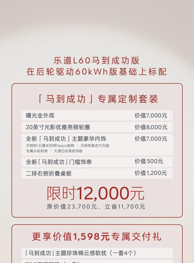 乐道品牌旗下中型SUV乐道L60推出全新特别版车型——马到成功版,于1月16日正式上市。该版本提供整车购买与电池租用两种方案,整车购买价格为21.89万元,若选择电池租用方式,价格为16.19万元。