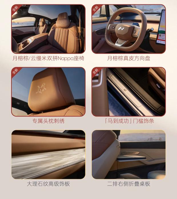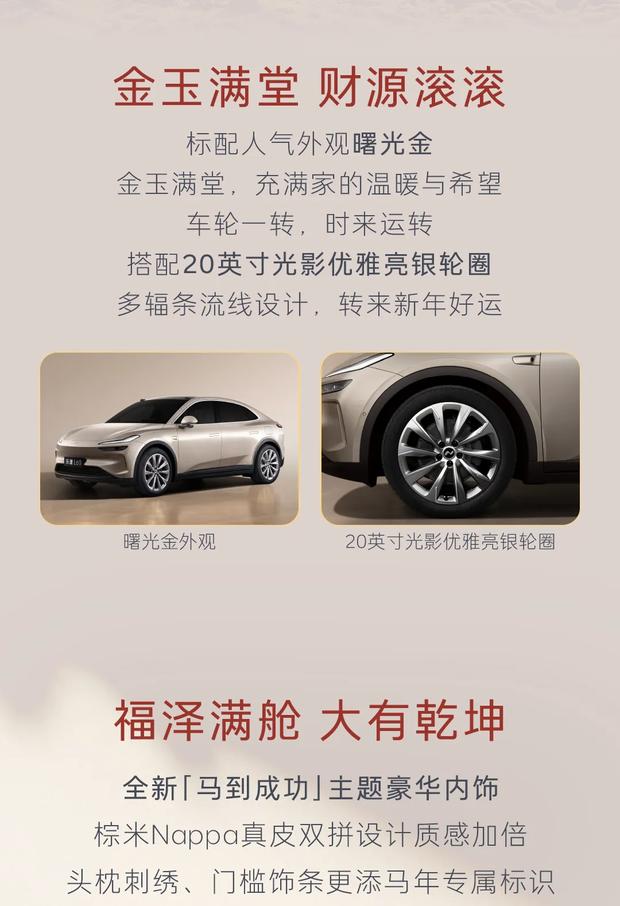 马到成功特别版基于后轮驱动60kWh版本打造。消费者可在限时内以1.2万元选装专属定制套装,内容包括曙光金外观涂装、20英寸亮银轮圈,以及内含月榕棕/云缦米双拼Nappa座椅、月榕棕真皮方向盘、专属头枕刺绣和大理石纹饰板的马到成功主题内饰。此外,套装还涵盖马到成功门槛饰条与第二排右侧折叠桌板。