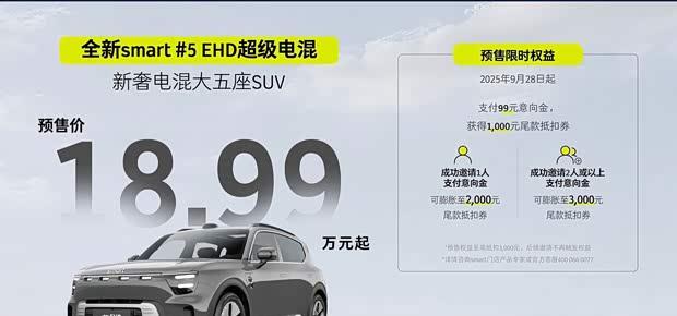 smart精灵#5 EHD插混版计划于10月底上市,目前已开启预售,预售价18.99万元起。新车延续“时空胶囊”设计语言,仅对后包围造型进行微调。内饰采用环抱式座舱设计,配备10.3英寸全液晶仪表、双13英寸AMOLED联屏及25.6英寸AR-HUD抬头显示。车身尺寸为4705/1920/1710mm,轴距2900mm。动力方面搭载雷神电混2.0技术,配备1.5T发动机,纯电续航252km,综合续航达1615km,支持20分钟内完成10-80%充电。