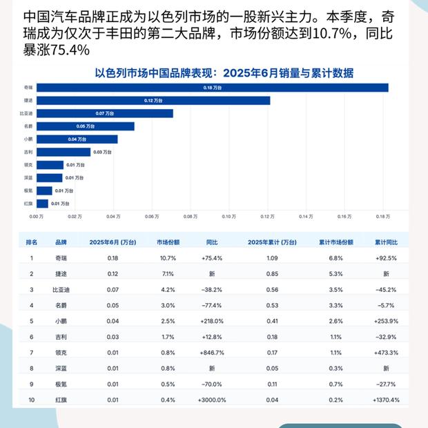 在巴以局势持续紧张的背景下,中国汽车品牌在以色列市场实现显著突破。继成功开拓南美、俄罗斯及东南亚市场后,以色列正成为中国汽车工业进军发达国家的重要跳板,并创下中国品牌在发达经济体中最高市场占有率纪录。