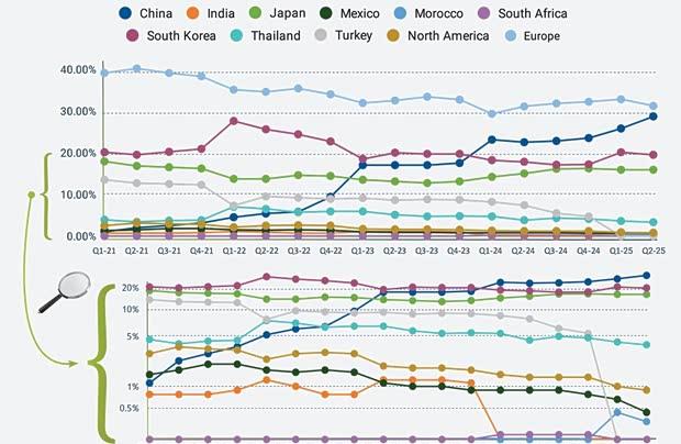 中国汽车在以色列整体市场占有率呈现爆发式增长。截至2025年第二季度,中国制造汽车市场份额已达28.7%的历史峰值,较2021年同期的1%实现跨越式增长。目前中国已成为以色列汽车进口来源国中唯一连续多年保持份额增长的国家,市场份额仅次于欧洲的31.2%,超越韩系车的19.5%与日系车的15.9%。