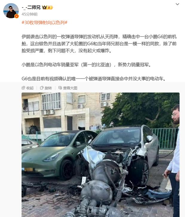 军事冲突中的意外事件为中国汽车赢得口碑。2025年6月伊朗对以导弹袭击中,一枚弹道导弹推进器坠毁引发多车起火,唯独被击中的小鹏G6SUV未出现燃烧现象,该事件在社交媒体引发广泛关注。