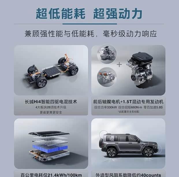 动力系统是本次升级的重点。新车搭载长城Hi4智能四驱电混技术,涵盖四大板块共计28项技术优化。具体来看,其采用1.5T混动专用发动机与前后双电机组合,系统综合最大功率330千瓦,峰值扭矩660牛·米,0-100公里/小时加速时间为5.8秒。车辆CLTC纯电续航最长可达255公里,WLTC综合续航里程超过1000公里。此外,新车还具备580毫米的最大涉水深度,并配备后桥电控机械牙嵌式差速锁,提供蠕行模式与转向辅助功能。