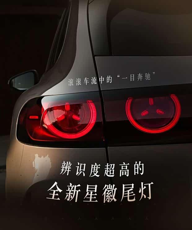 车身侧面采用了隐藏式门把手与多区智控星徽全景天幕的设计。整车尺寸方面,长宽高分别为4949毫米、1970毫米和1710毫米,轴距达到3027毫米。车尾部分则采用了全新的星徽尾灯造型。