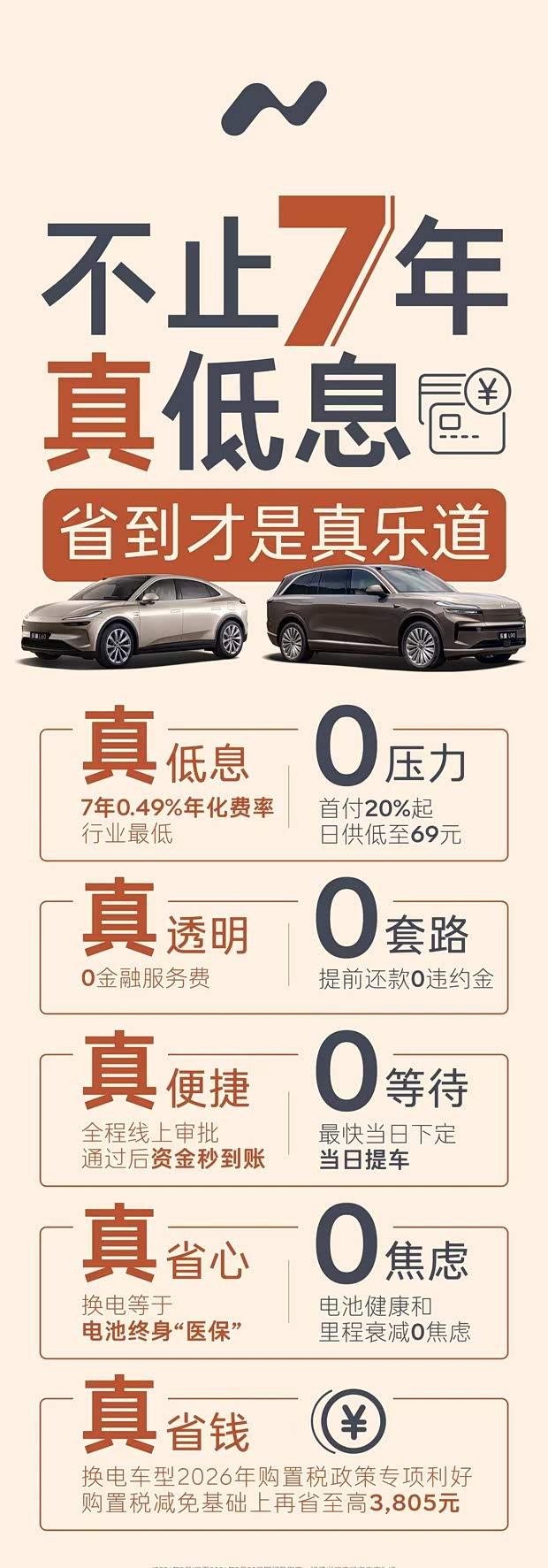 为促进销售,蔚来品牌针对新ET5、ET5T、ES6及EC6车型,乐道品牌针对L60与L90车型,同步推出了7年期超低息购车方案。该方案年化费率仅为0.49%,不收取金融服务费,且提前还款无需支付违约金。旗下萤火虫品牌也推出了相应的7年低息方案,首付1.6万元起,月供最低840元,锁单用户还可获赠马年新春礼包。