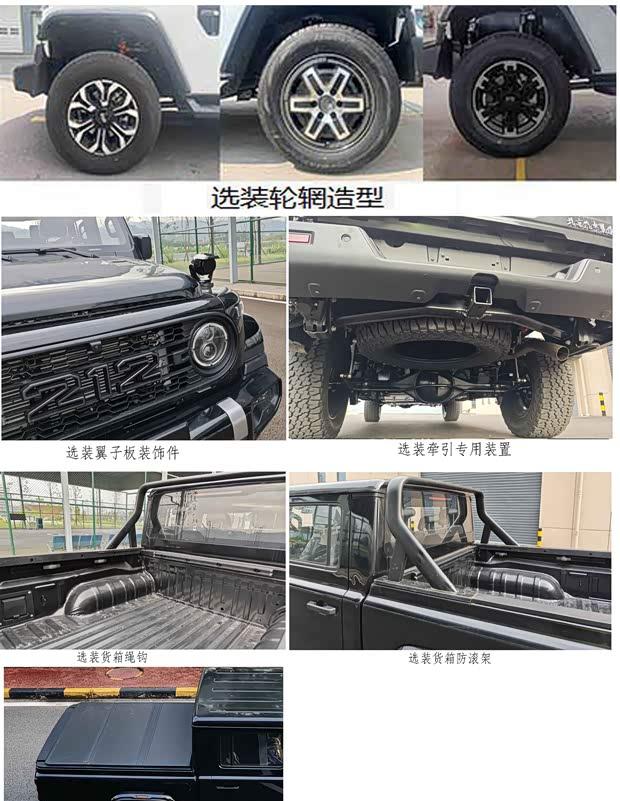从申报图来看,新车延续了212家族标志性的硬朗设计语言,前后保险杠、轮圈造型及翼子板等细节均强化了越野属性。车身长宽高分别为5469mm、1955mm、1970mm,轴距达3488mm。货箱栏板内部尺寸为1555mm×1520mm×490mm,接近角与离去角分别为42°/26°及42°/24°两种规格。