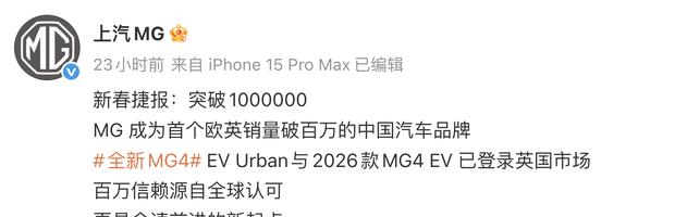 上汽集团旗下名爵品牌近日宣布,其在欧洲与英国市场累计销量已突破百万辆,成为中国汽车品牌中首个达成此成就的品牌。与此同时,全新MG4 EV Urban及2026款MG4 EV车型已正式在英国上市。