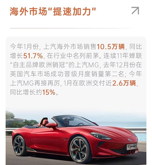 市场数据显示,该品牌已连续十一年在欧洲市场保持中国自主品牌销量领先。去年12月,名爵在英国单月销量排名升至市场第二位,超过福特、现代、丰田等国际知名品牌。今年1月,其在欧洲交付量接近2.6万辆,较去年同期增长约15%。