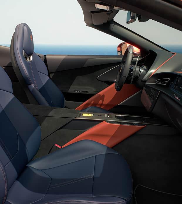 车尾设计因敞篷结构而更显平台化,腰线向后延伸形成宽体效果,搭配双边四段式尾灯与碳纤维后包围。排气系统采用双边共四出布局,并配有中置扩散器。主动空气动力学系统提供三种尾翼模式,同时整合一键式挡风板,以优化敞篷驾驶体验。