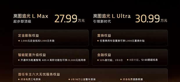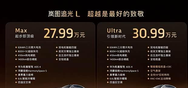 岚图品牌旗下全新插电混动车型追光L于12月10日正式推向市场。此次上市共提供两款配置,官方指导价格分别为27.99万元与30.99万元。该车定位为中大型轿车,车身长度超过5.1米,基于800V高压平台打造,并搭载华为乾崑智驾ADS 4系统与鸿蒙座舱5.1系统。据悉,未来该车将与岚图泰山共同构成品牌的双旗舰产品矩阵。