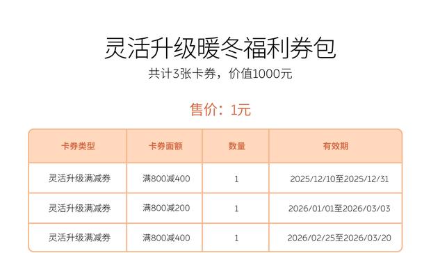 此次福利券包销售时间为2025年12月10日至12月31日,每份券包内含两张“满800减400”及一张“满800减200”优惠券,适用于电池灵活升级月租订单的现金抵扣。购买资格限定为电池规格为标准续航60kWh车型的主用车人,每辆车仅可购买一次。