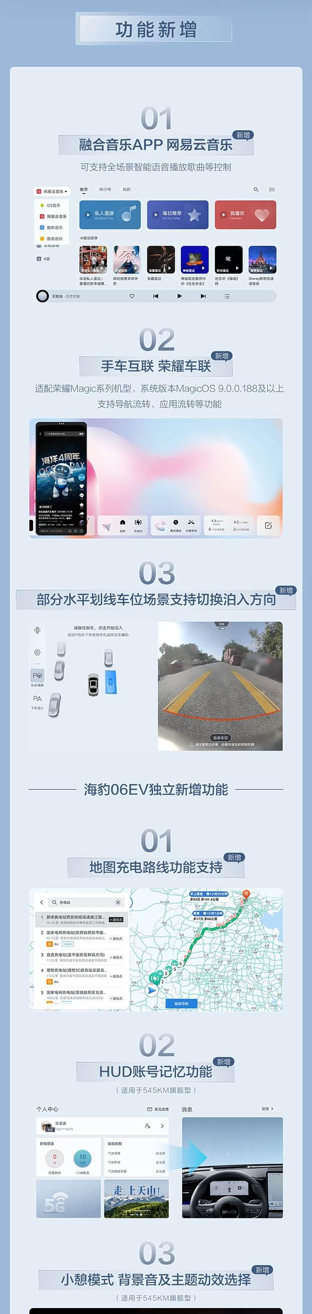 本次升级新增了网易云音乐、荣耀车联等功能,并针对部分水平划线车位提供了泊入方向切换支持。海豹06 EV车型还额外获得了地图充电路线规划、HUD账号记忆以及小憩模式等实用功能。