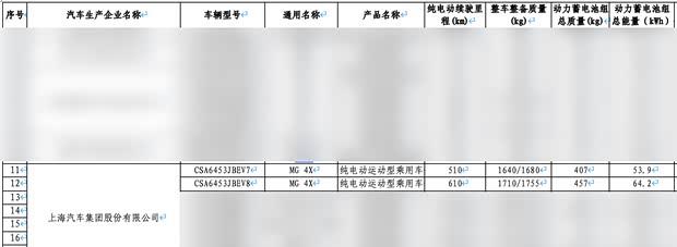 近日,MG品牌旗下全新纯电动车型MG 4X正式进入新能源汽车购置税减免目录,标志着该车型即将进入市场。根据相关公示信息,新车将提供两种电池容量选择,分别为53.9kWh和64.2kWh,对应的CLTC工况续航里程可达510公里和610公里。
