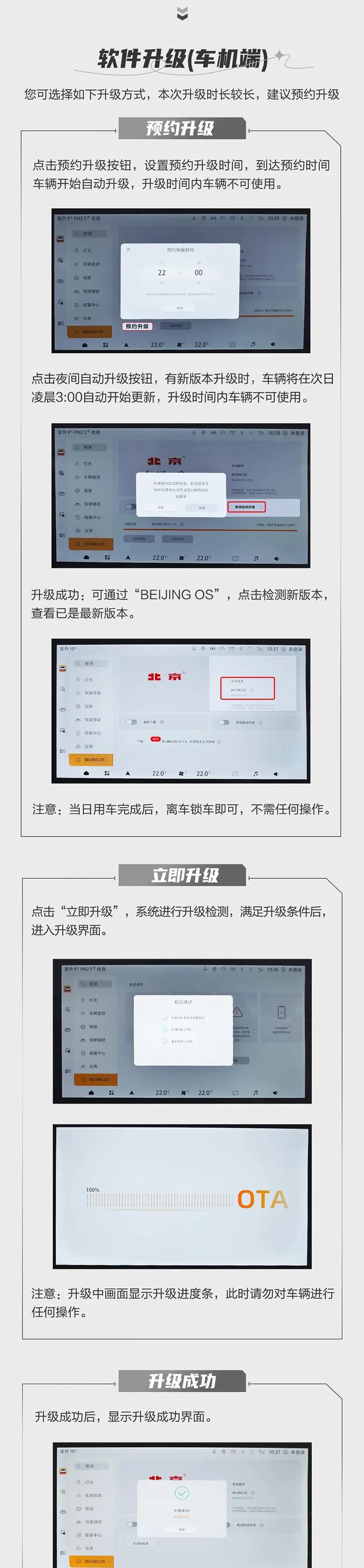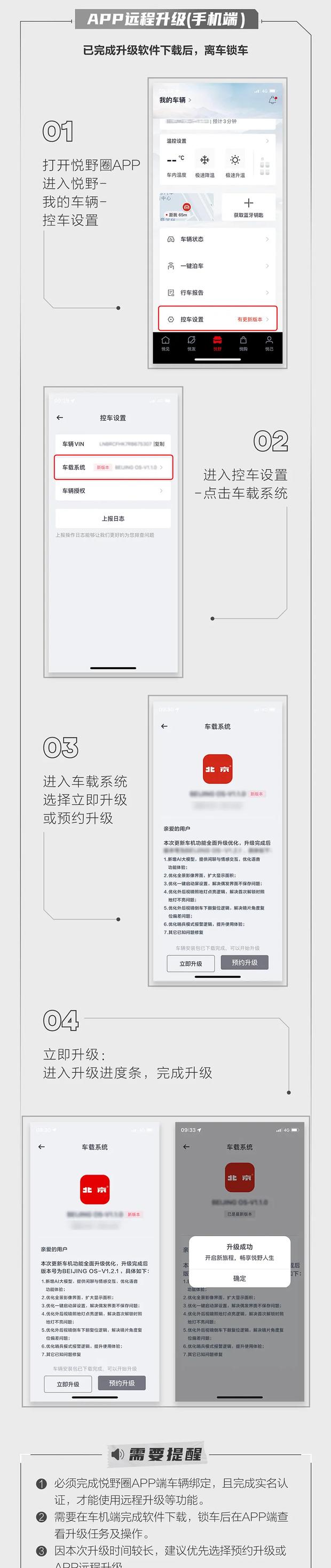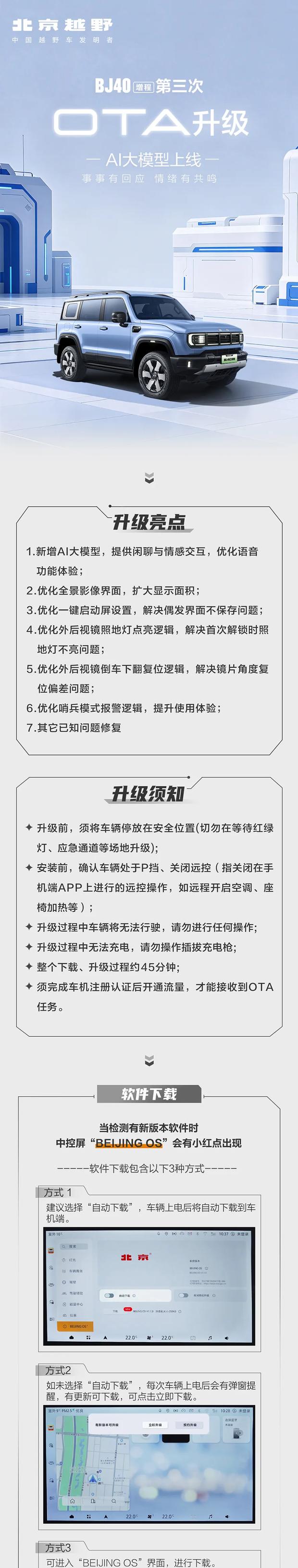 用户可选择立即升级、预约升级或通过手机应用远程操作。升级前需确保车辆完成车机注册认证并开通网络服务,方可接收OTA推送。升级期间车辆无法行驶及充电,北京越野将承担全部升级流量费用。