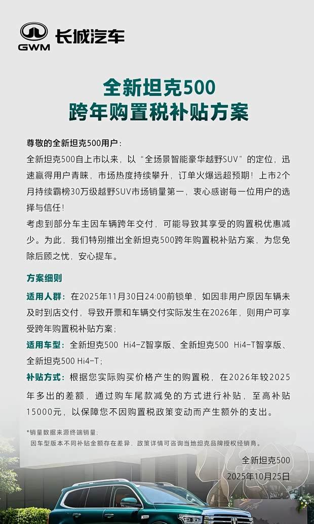 坦克品牌近日发布针对坦克500车型的跨年度购置税补贴计划。官方表示,该政策旨在解决因车辆交付时间跨越不同年度,可能导致消费者享受的购置税优惠产生变化的问题。