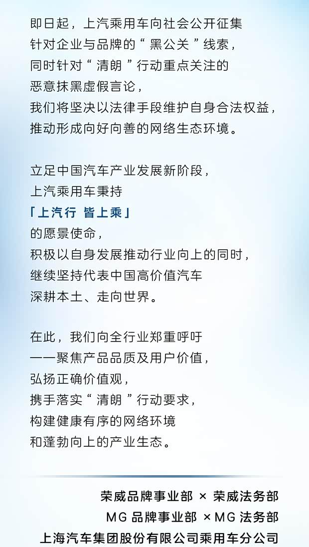为净化网络环境,上汽乘用车即日起面向社会公开征集有关企业和品牌的"黑公关"线索。同时,针对近期"清朗"专项行动重点打击的网络恶意造谣行为,公司将坚决运用法律武器维护合法权益,共同营造健康有序的网络空间。