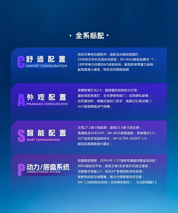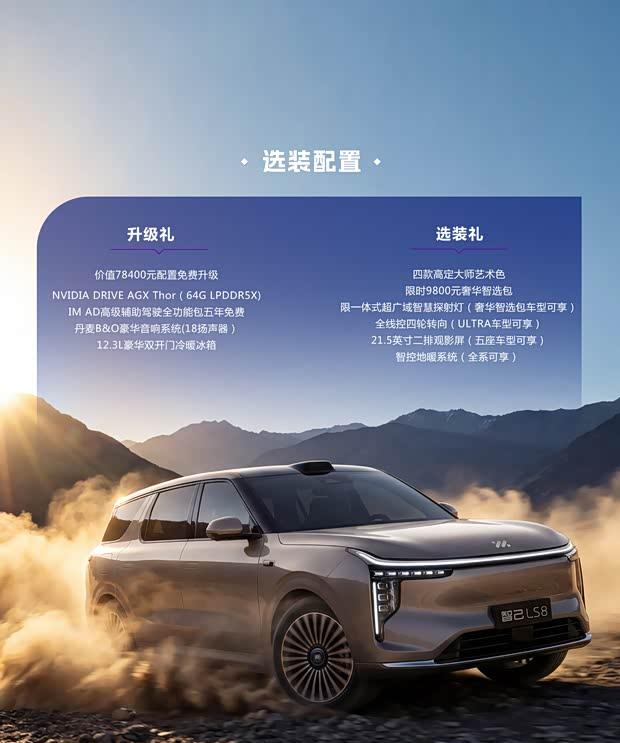 在标准配置方面,智己LS8全系车型均展现出旗舰级水准。舒适性配置涵盖剧院级氛围灯、高端品牌音响与多向调节舒适座椅;外观则标配智慧灯光系统、静音电吸门及智能空气动力组件。智能层面,新车搭载高性能座舱芯片与超远距激光雷达,配合全场景智能座舱系统,科技感与实用性并存。动力与底盘部分,全系采用恒星超级增程系统与800V高压快充平台,并配备灵蜥数字底盘、智能空气悬架及四轮转向系统,兼顾操控性能与乘坐舒适性。