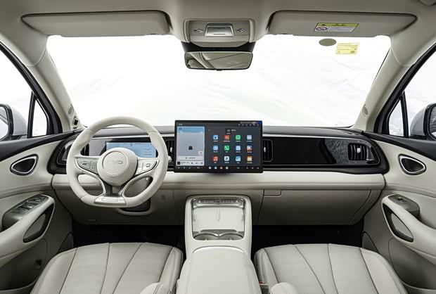 进入车内,海狮05 DM-i采用环抱式海洋律动座舱设计,风格简约温馨,注重家用舒适性与科技感的融合。内饰提供杏仁米等配色方案,座椅及中控台等接触区域大量使用软质材料包裹,配合细腻缝线与镀铬装饰,触感和质感均符合其车型定位。配置方面,新车搭载嵌入式全液晶仪表与自适应旋转悬浮中控屏,中控屏周围以贯穿式饰板覆盖,实体按键大幅简化,仅保留横向排列的常用功能按键。方向盘为三辐平底造型,并采用电子怀挡设计。中央通道区域设有双手机无线充电面板,提升了日常使用的便利性。