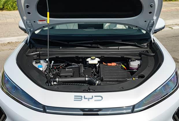 车尾部分设计简洁饱满,采用熏黑贯穿式尾灯组,内部融入了品牌特有的光源结构,中央镶嵌“BYD”标识,点亮后具有较高辨识度。车顶配备分段式扰流板,后包围造型厚实,排气则为隐藏式布局,整体风格与前脸相呼应。