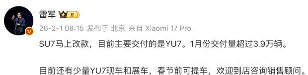 小米汽车近日公布1月销量数据,当月交付量突破39000辆。随后,企业创始人雷军在社交平台透露,小米SU7即将迎来改款,当前主要交付的是YU7版本,尚有少量YU7现车与展车可于春节前提车。