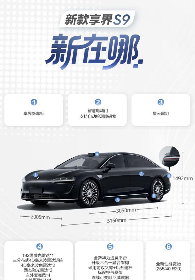 在智能驾驶系统方面,新车搭载36个高精度传感器,标配四激光雷达系统,前向感知升级为3分布式毫米波雷达矩阵。同时首次配备车外麦克风,并搭载华为乾崑智驾ADS 4系统,显著提升辅助驾驶与主动安全性能。