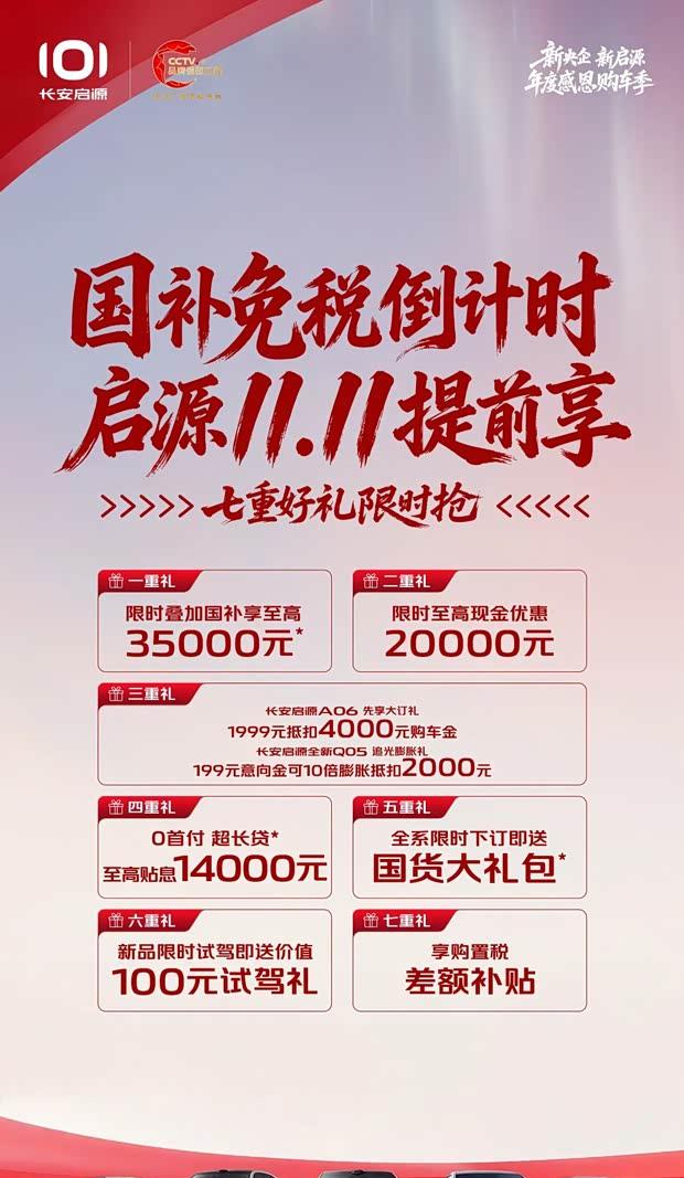 长安汽车旗下品牌启源近日启动双11促销活动,推出七项优惠措施,活动将持续至10月31日。