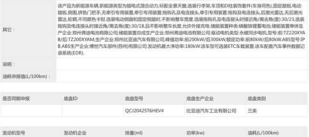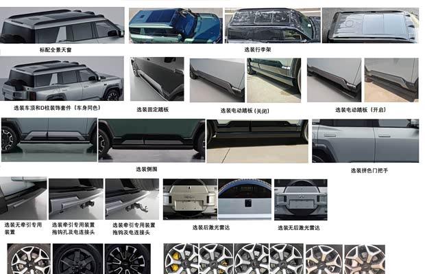 在配置方面,申报信息显示车辆标配全景天窗,并可选装行李架、车身同色车顶及D柱装饰套件、固定或电动踏板以及牵引专用装置。此外,后激光雷达、不同款式的轮圈及彩色刹车卡钳也出现在选装列表中。