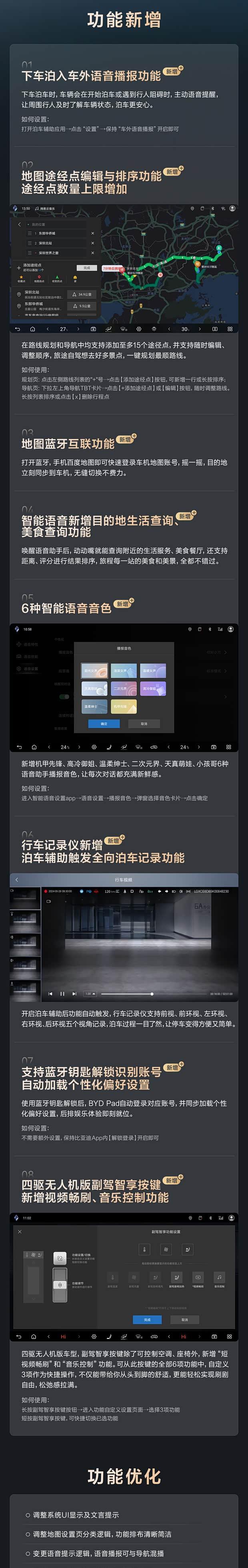 新增功能包括:泊车过程中车外语音播报系统,可在识别行人时主动发出提醒;地图导航新增途经点编辑与排序功能,并提升途经点设置上限;通过蓝牙互联技术,用户可通过手机摇一摇将目的地同步至车载系统;智能语音新增美食查询服务,并提供六种语音音色选择,包括童声等特色音色;行车记录仪新增全向泊车记录触发功能;蓝牙钥匙解锁时可自动识别账号并加载个性化设置;四驱无人机版新增副驾智享按键与视频畅刷功能。
